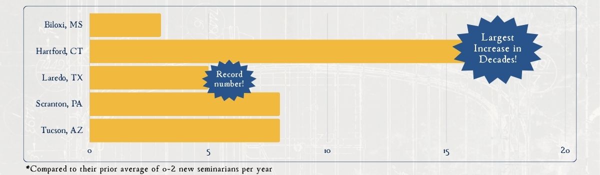 Multiplique su impacto en cada parroquia de su diócesis. La gráfica a continuación destaca los inspiradores resultados de nuestras diócesis asociadas reales, mostrando el número de hombres que ingresaron al seminario en los dos años siguientes a su colaboración con Vocation Ministry, lo que demuestra el profundo y mensurable crecimiento vocacional que nuestros talleres pueden impulsar.