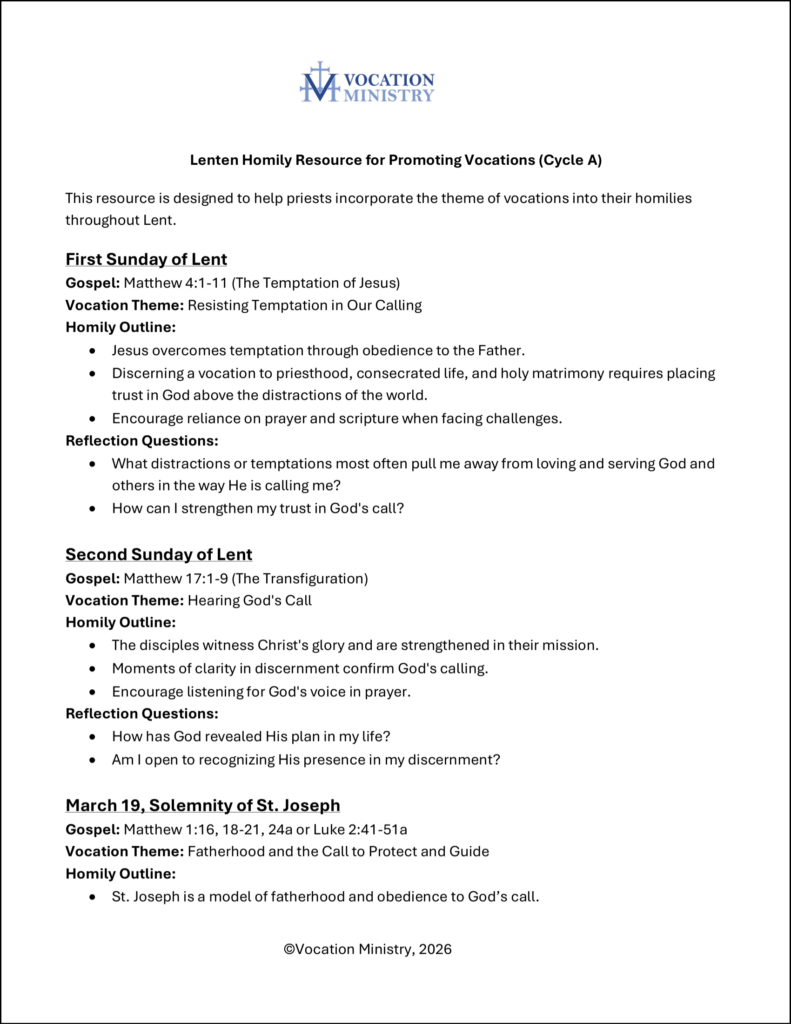 These resources will help parishes seamlessly incorporate vocations into their Lenten journey through prayers, homily reflections, bulletin inserts, and practical activities. By integrating vocation awareness into Lenten devotions and parish life, we create a culture where more men and women are open to hearing and answering God’s call.